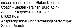 Verantwortlicher im Sinne der Datenschutz-Grundverordnung, sonstiger in den Mitgliedstaaten der Europäischen Union geltenden Datenschutzgesetze und anderer Bestimmungen mit datenschutzrechtlichem Charakter ist die: Image Management Unternehmensberatung (Kontaktdaten siehe am Anfang dieser Seite).